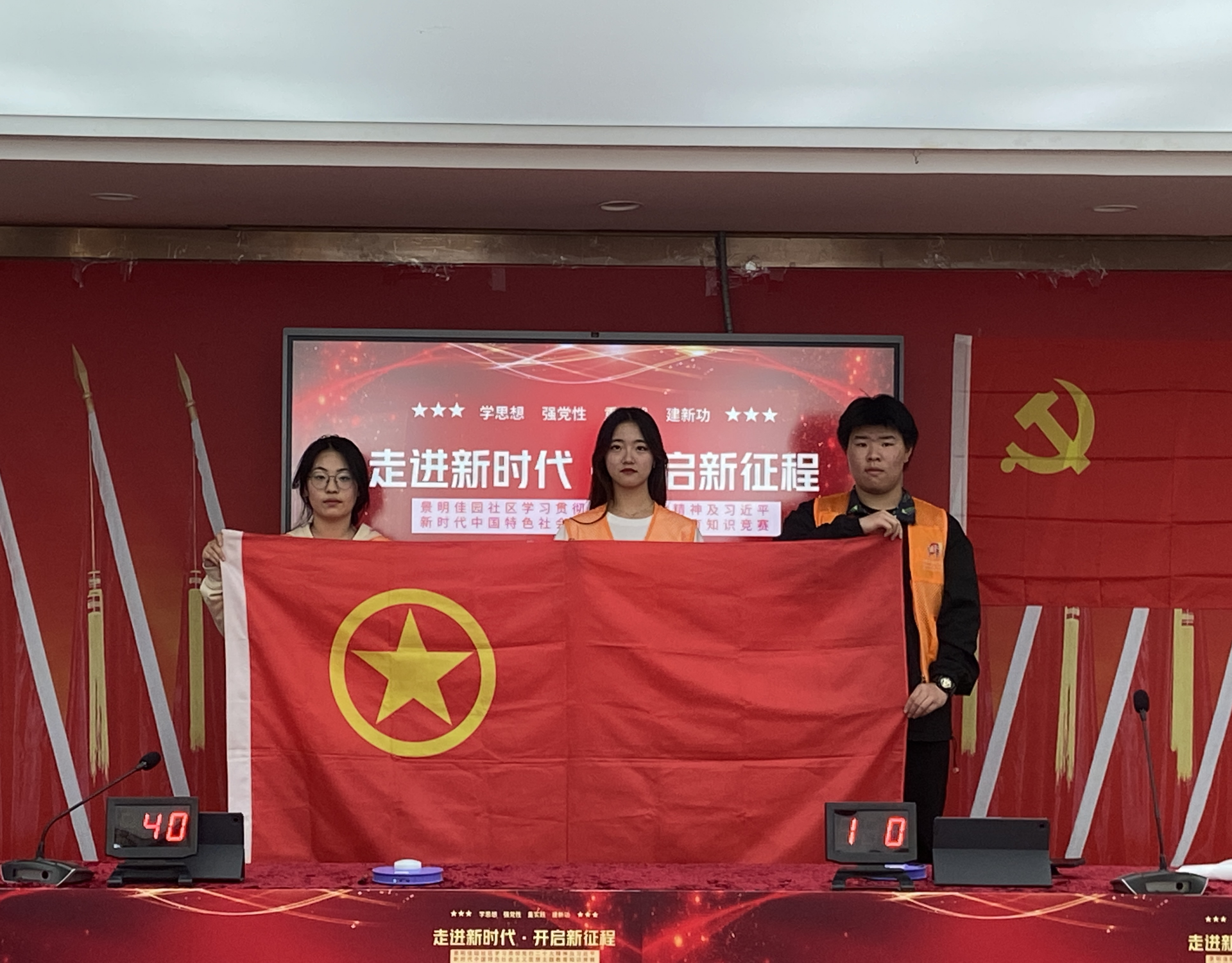 为深入学习贯彻党的二十大精神,引导支部成员和入党积极分子自觉以习近平新时代中国特色社会主义思想武装头脑,4月26日上午,由中共景明佳园社区党委举办的党建联建“党的二十大”精神及习近平新时代中国特色社会主义思想主题教育知识竞赛在景明佳园社区党群服务中心举办,除承办单位外,还有铁心桥街道新时代文明实践所、铁心桥卫生服务中心党支部、景明佳园小学代表队等8个队参与竞赛,blh漫画 艺术设计与建筑工程系在支部书记陈宏波的选拔下,派出了由程启芳老师领队,三名入党积极分子组成的“红心”代表队参赛,队伍由陆凌岩、戴润江、朱洁雯三名同学组成。