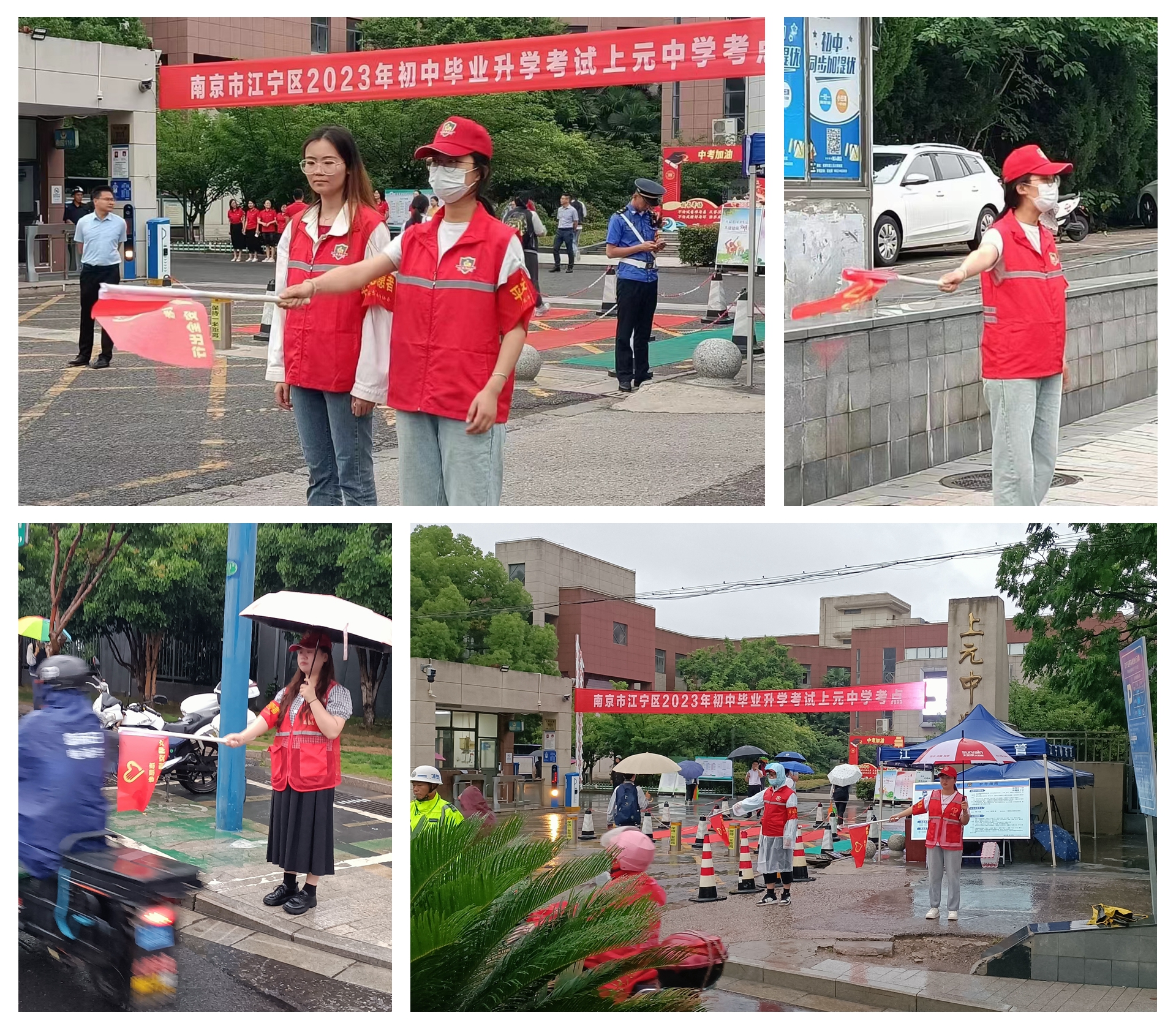 6月17日至18日早上六点,志愿者们又来到江宁上元中学中考考点,化身“交通协管员”,穿梭在考点周边,进行文明引导、秩序维护,提醒送考的家长遵守秩序,不要大声喧哗,为考生们安心考试营造一个有利环境,现场还设置了“爱心护考岗”,为中考考生和家长开展提供矿泉水、文具套装、降温防暑药品及休息场地等服务。志愿者们坚守岗位,精心守护各考点的安全和宁静,为中考学子的梦想之舟护航!