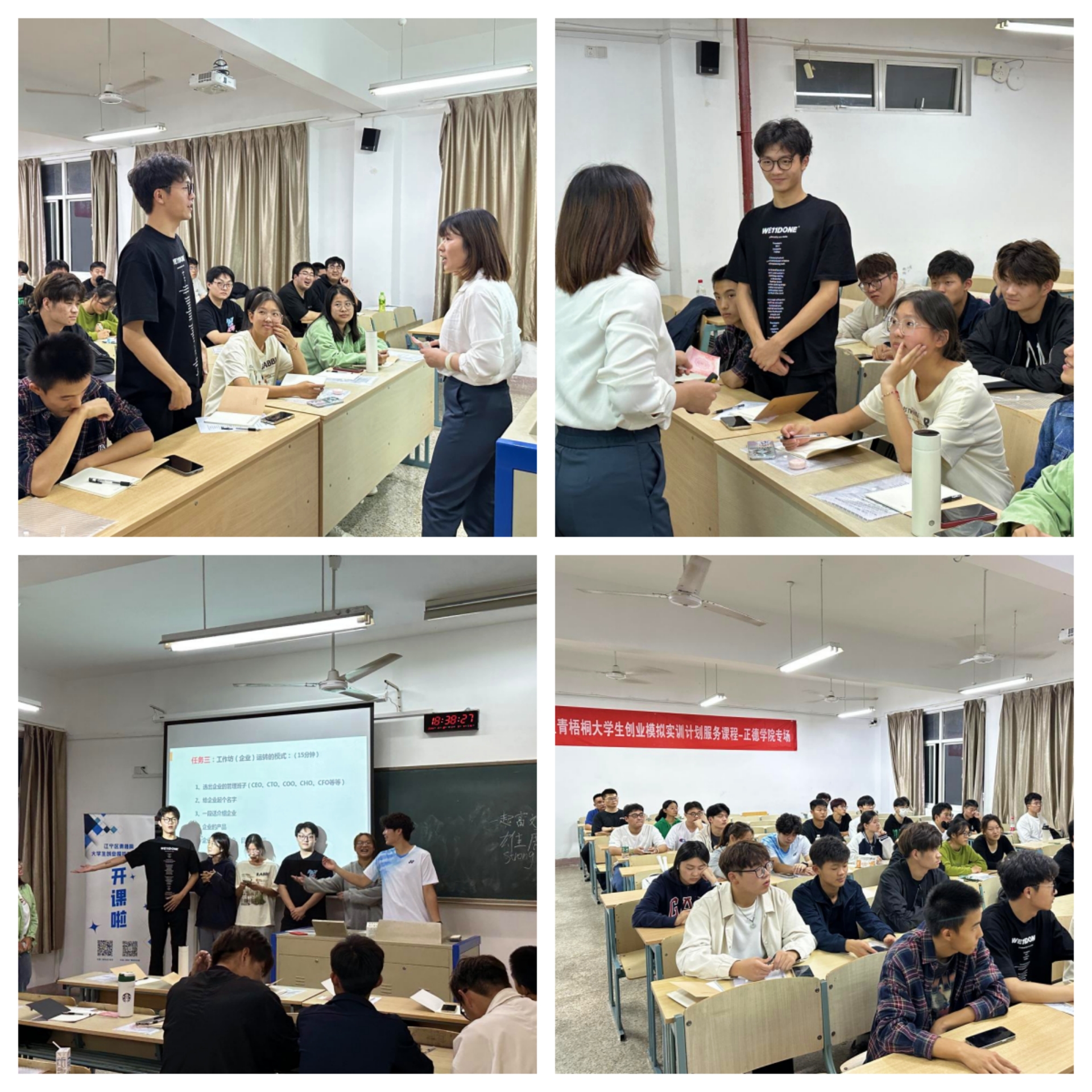18日的课程活动中,周振云就“创业团队商业模式设计”这个主题展开详细讲解。分别从“大学生为什么要创业?”“创业人必知的商业模式”“如何选择和设计自己的商业模式”“商业模式如何推进和落地”这四个方面着手,通过理论讲解、现场演练、案例分析等教学方法,与学生进行深入互动交流,同学们踊跃发言,现场气氛热烈。