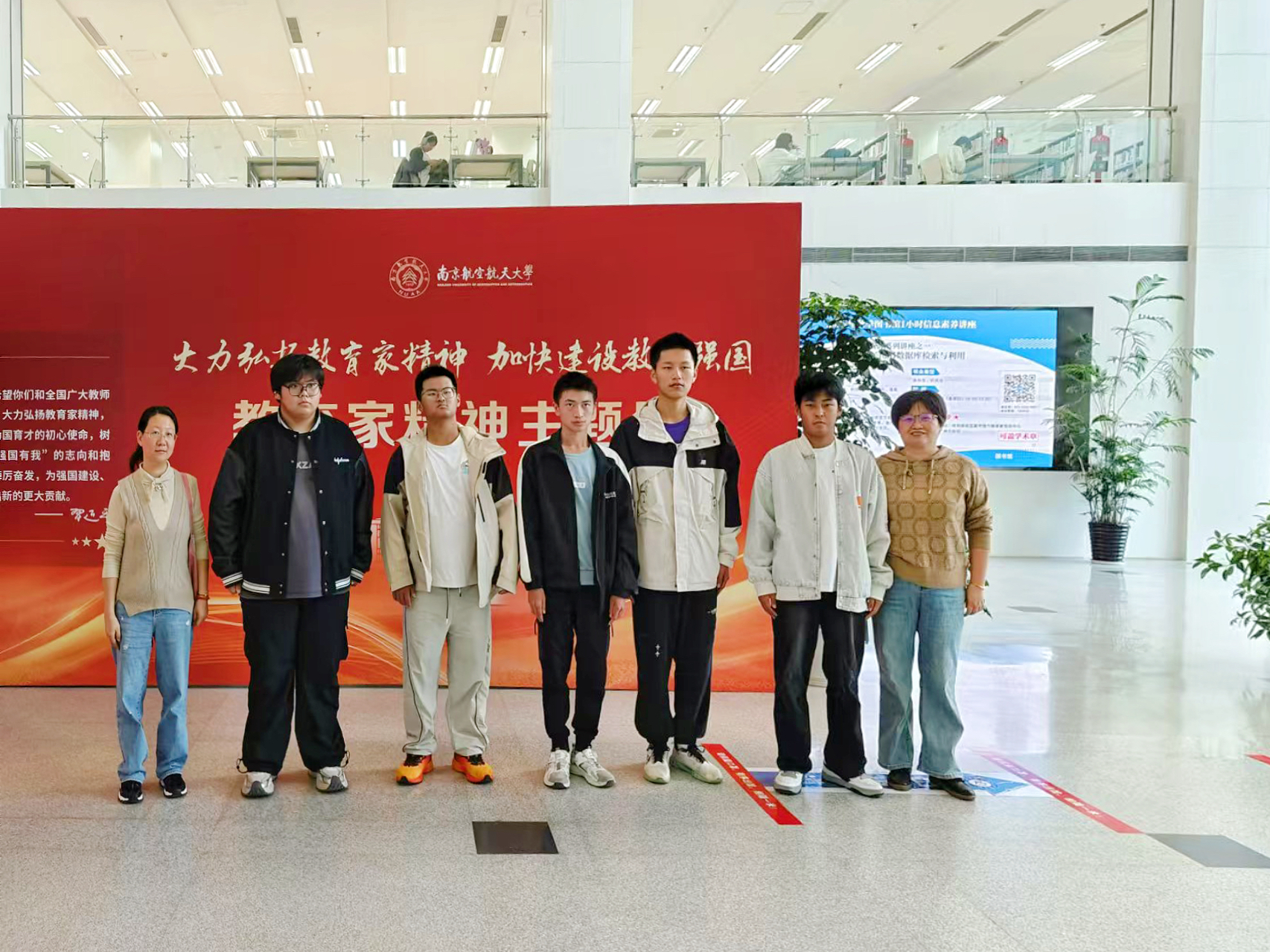戴慧、刘婧两位老师带领同学们参观南航图书馆内的教育家精神主题展。本次主题展以丰富的图文、珍贵的历史资料,全面呈现了不同时期教育家们的卓越贡献和伟大精神。同学们认真阅读着每一位教育家的事迹介绍,学习前辈,学习榜样,学习精神,一起感悟师者力量。此次教育家精神学展,不仅为新生上了一堂生动的“入学课”,也为教师们打造了“从教一课”。