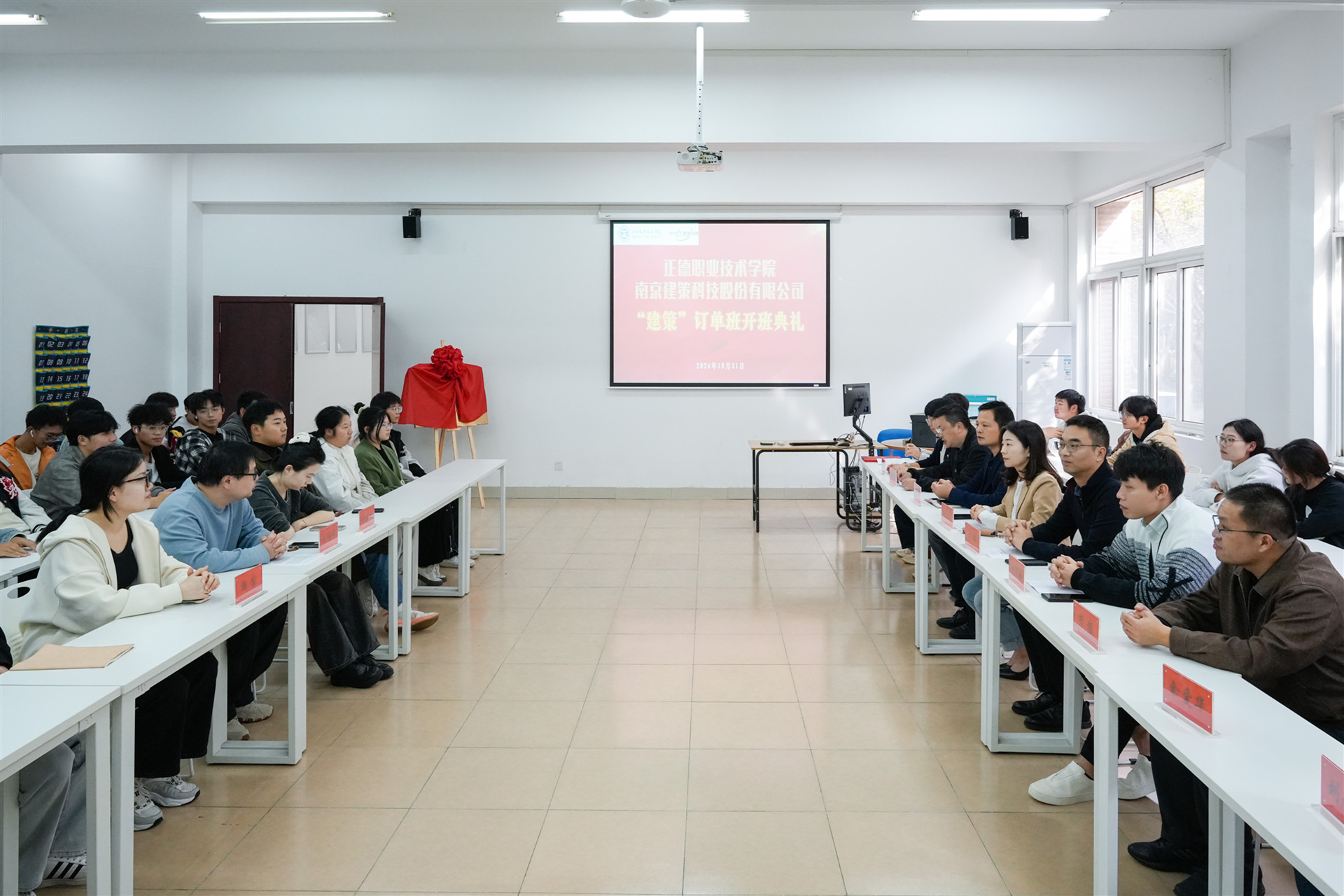 南京建策科技股份有限公司副总经理张林炜、总经理助理刘佳佳,市场部经理陆苗,学院院长助理、招生就业处处长王墀、招生就业处副处长张智灏,电子与信息技术系主任刘佳、副主任张宝华、计算机网络技术专业负责人张韬,专任教师余爱华、李俊、李红艳、辅导员刘敏婧,以及建策订单班全体同学共同见证了这一重要时刻。仪式由张韬主持。
