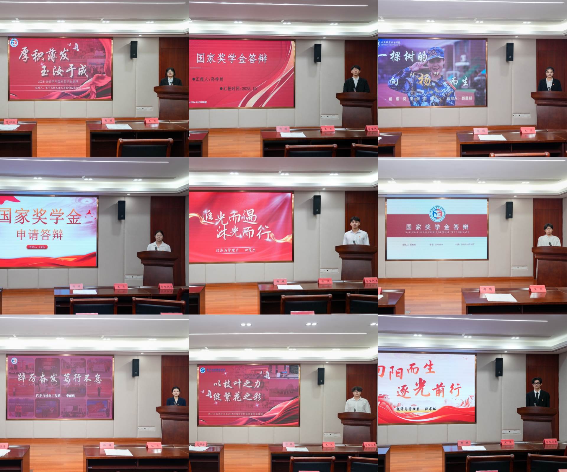 经个人申报、各系推荐、学院审核,共有9名候选人入围院级答辩,答辩环节中,候选人通过PPT介绍,将个人成长故事娓娓道来。从名列前茅的学业成绩到职业技能的创新突破,从斩获佳绩的专业竞赛到扎根基层的社会实践,每一个亮眼成果背后,都是新时代青年“敢闯敢拼、善学善思”的生动写照,精彩汇报引得现场掌声不断,彰显了新时代正德学子刻苦努力、勤学奋进、勇于担当的良好风貌。