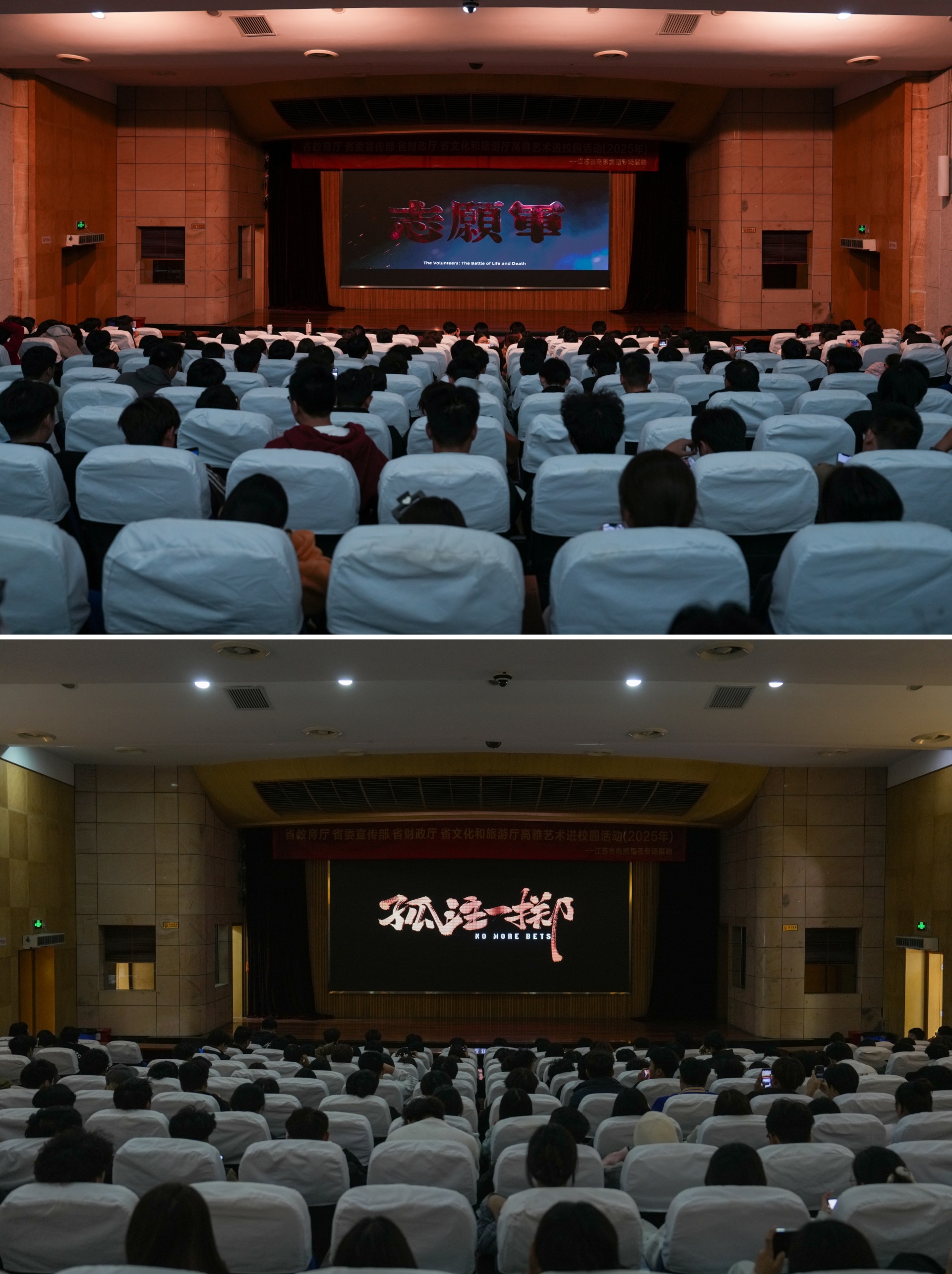 为深入推进校园文化建设,深化爱国主义教育,发挥优秀影视作品的思想引领作用,10月23日下午,我院联合江苏省电影集团在报告厅举办“青春光影 逐梦未来”主题电影专场放映活动。本次活动精选两部兼具思想深度与艺术价值的影片《孤注一掷》《志愿军:存亡之战》,通过光影艺术为师生呈现了一场震撼心灵的精神盛宴,吸引近七百名师生到场观影,其中《志愿军:存亡之战》以其厚重的历史底蕴和强烈的情感共鸣,成为全场瞩目的焦点。