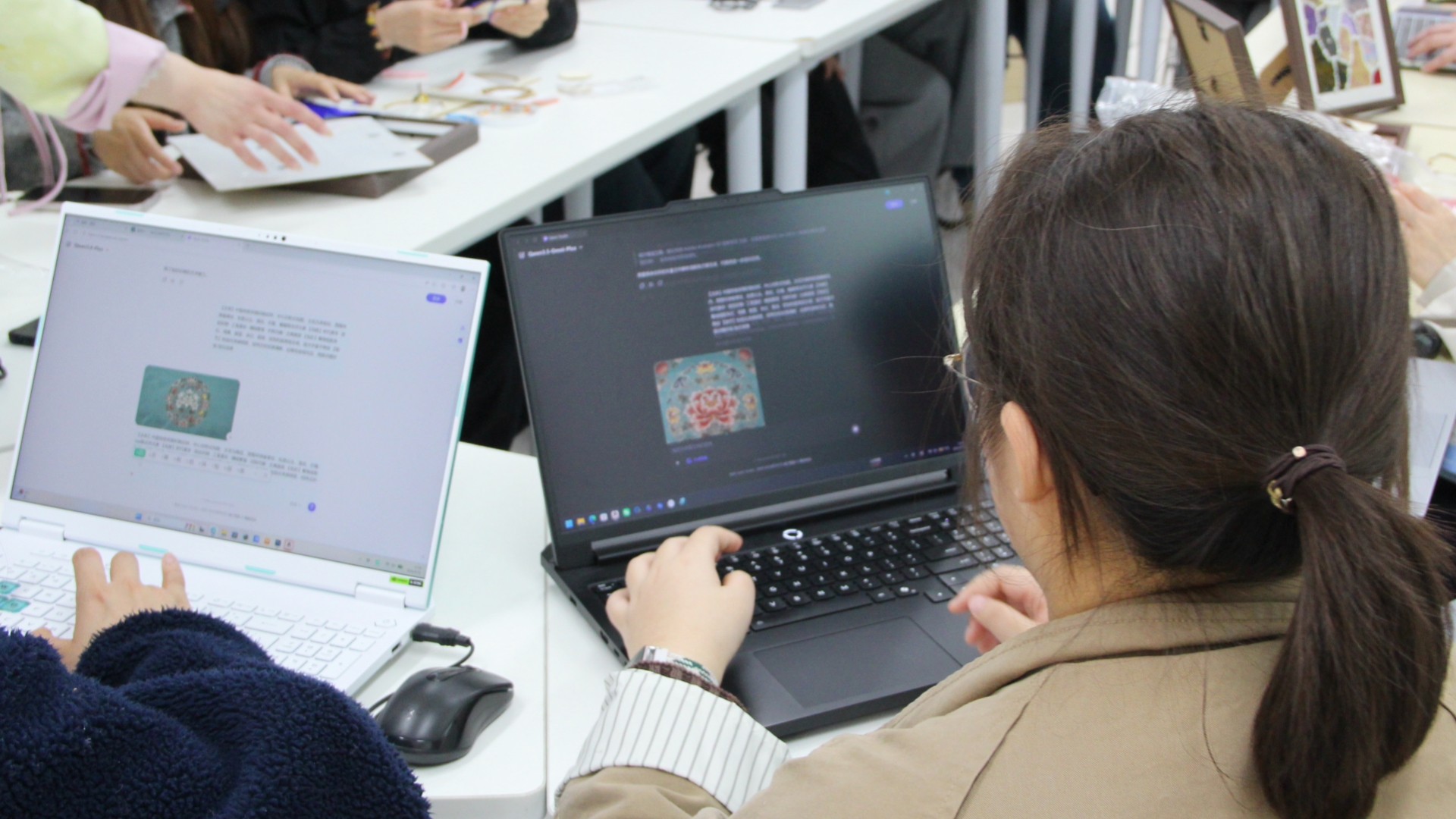 随后,艺术设计与建筑工程系教师吴青展示了AI绘图的使用技能,通过实际操作示范如何通过精准输入关键词,避免偏离传统风格,生成贴合非遗特色的宋锦纹样。学生们认真聆听、积极实操,纷纷尝试生成专属宋锦纹样,亲身感受数字技术为非遗创作带来的便捷与创新。