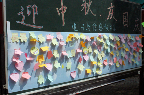 活动刚刚开始,偌大的空地已经挤满了人,节日的气氛在许愿墙的烘托下,更加浓郁。随着大一新生军训午休息时间的到来,大家纷纷参与到活动中,他们在贴纸上写下自己对亲人朋友的深深祝福并贴在展板上,同时还得到了学生会赠予的小礼物