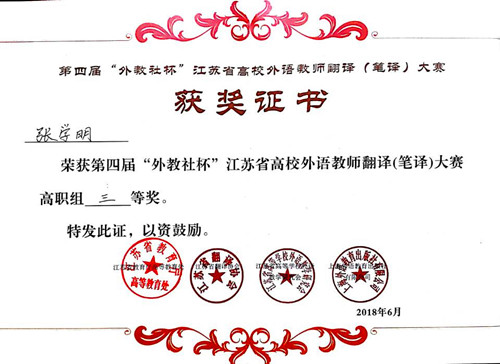 6月24日下午,第四届“外教社杯”江苏省高校外语教师翻译(笔译)大赛决赛在江苏师范大学外国语学院落下帷幕,blh漫画 基础教育系张学明老师荣获三等奖。