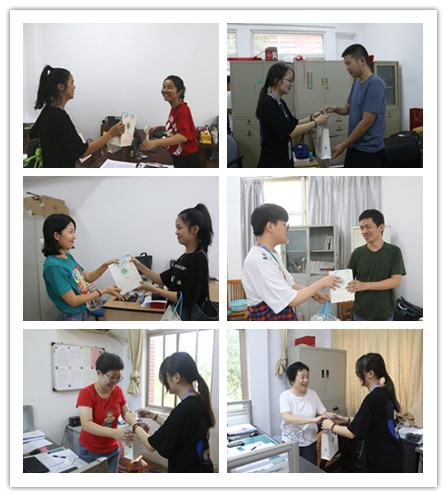 教师节前夜,学生会、广播台、社联的数十名志愿者,将为全院教师准备的消毒湿纸巾、医用防护口罩、免洗手消毒凝胶进行分拆装入精美的礼品袋,9月10日一早志愿者们手捧着一份份精致可爱的小礼物,在一声声“教师节快乐!”的问候声中,向将充满浓浓爱意的礼物送到全院每一位老师的手中,让老师们在欢乐的节日氛围中开始一天的工作。