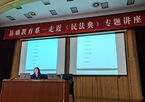 为进一步强化学生的法律意识,增强学生学法懂法,自觉践行法律的主动性和自觉性,2021年3月25日,基础教育系邀请了江苏承匠律师事务所合伙人、党支部书记刘媛媛律师,为该系全体大一学生作了一次走近《民法典》主题讲座。