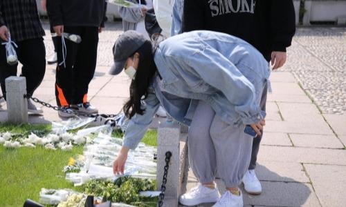 同学们怀着无比崇敬的心情敬献花束,向为今天幸福生活献出生命和鲜血的革命先辈们致敬默哀,寄托对革命先烈的无限缅怀和深切思念。