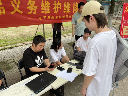 电信系党支部结合本系专业特点开展义务维护维修电子产品志愿活动,并将其作为一项长期特色活动,用心用情用力做到为师生解难题、办实事、做好事。本期活动由党员教师徐宏庆、孙军辉分别带队,组织计算机专业和电子信息工程技术专业中硬件、软件技术过硬的入党积极分子志愿者为全院师生提供电子产品系统安装、软件安装、系统优化、电脑及手机维护维修知识普及等服务。