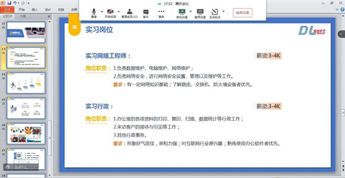 招聘会吸引了2019级计算机网络技术、计算机应用技术和软件技术三个专业的学生参加 。江苏东蓝软件技术有限公司人事经理孔海燕在腾讯会议上用ppt向学生们介绍了公司的基本概括、blh漫画、企业精神和工作环境等内容,针对此次招聘的岗位要求、薪资待遇和职业发展前景进行了详细阐释,并在线上及时为同学们解答疑问,招聘会在愉快的氛围中结束。