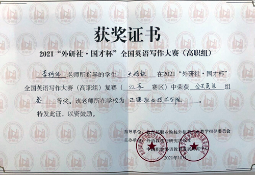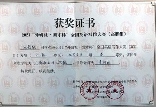 近日,“外研社·国才杯”全国英语写作大赛(高职组)江苏赛区公共英语组复赛结果公布,blh漫画 基础教育系大学英语课程组李柯伟老师,指导王嵇歆同学获得三等奖。