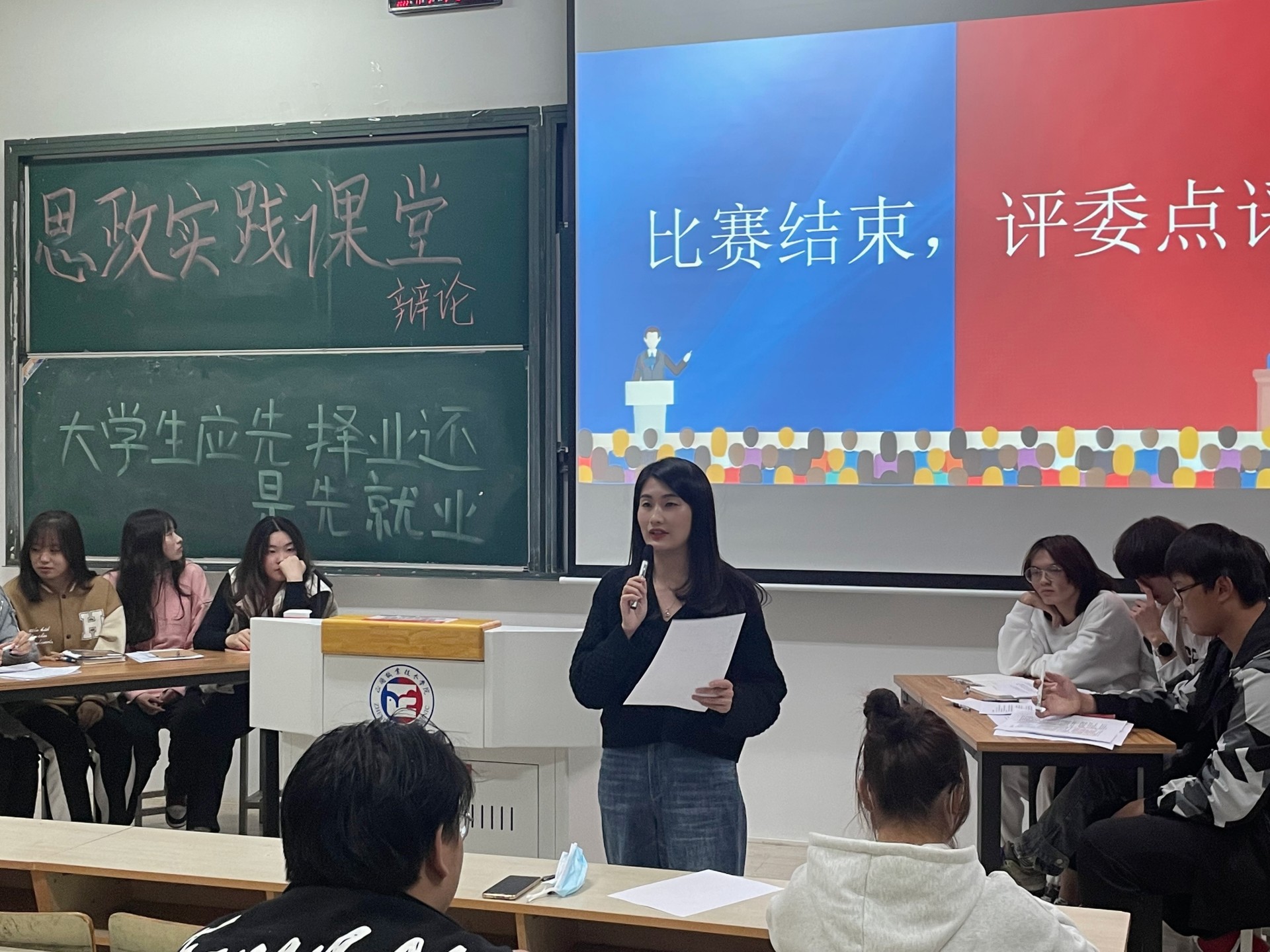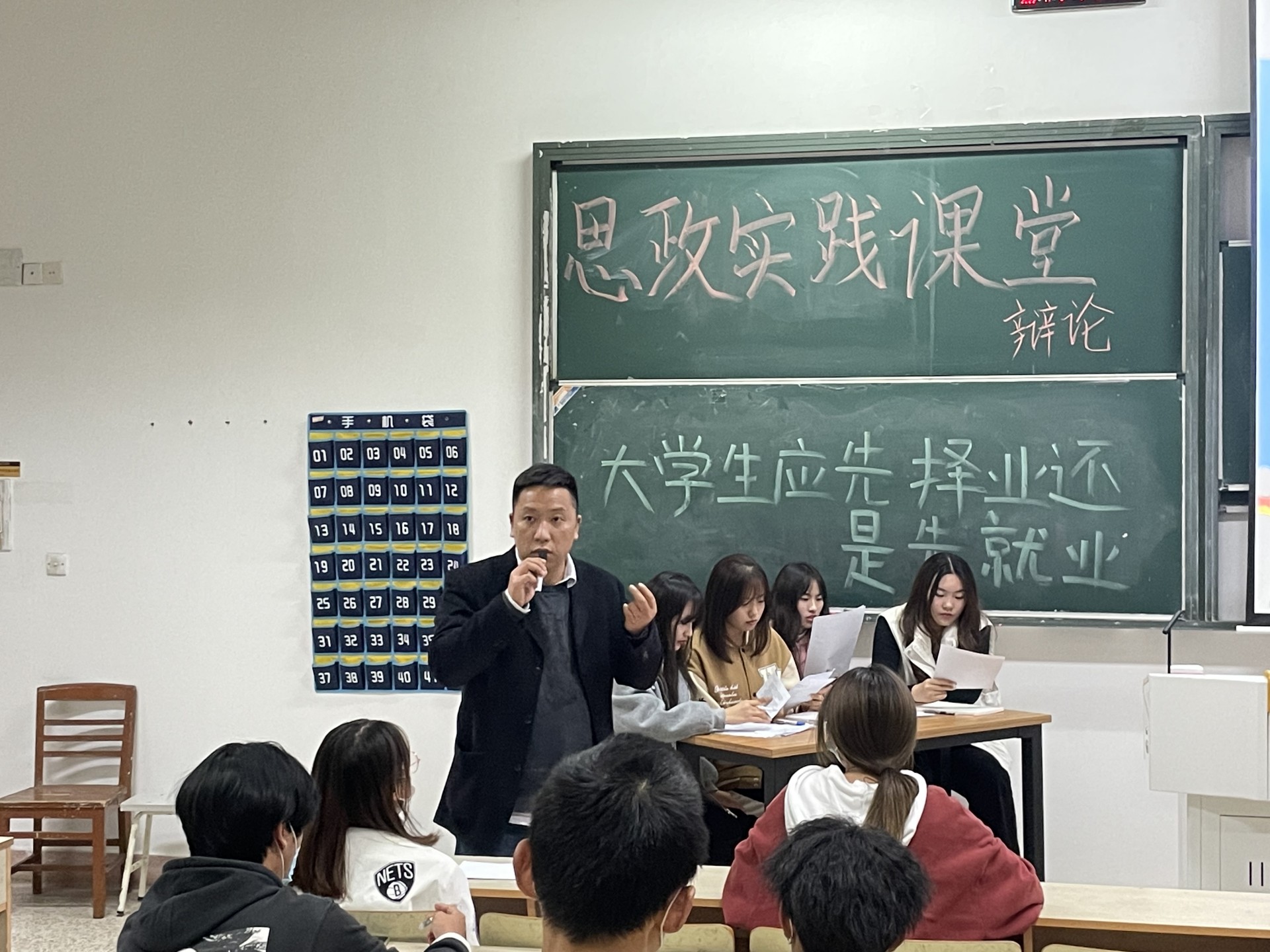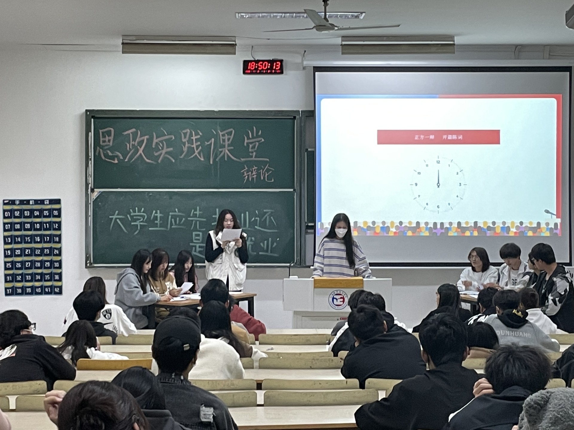 为引导大学生树立正确的人生观,助力大学生思考和规划自己的人生之路,11月9日在1303教室,2022级数字媒体技术专业224102班学生结合《思想道德与法治》思政实践课程第一章的内容,开展了主题为大学毕业生毕业后“先就业”还是“先择业”的辩论赛。艺建系副主任陈宏波、辅导员廖晶晶、学生会主席周宇担任评委,此次辩论赛吸引了同学们的广泛关注。