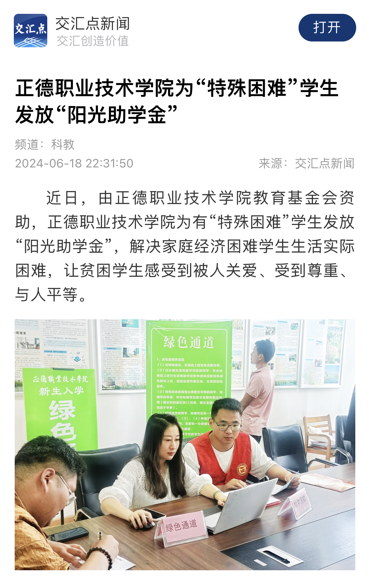 【交汇点新闻】正德职业技术学院为“特殊困难”学生发放“阳光助学金”