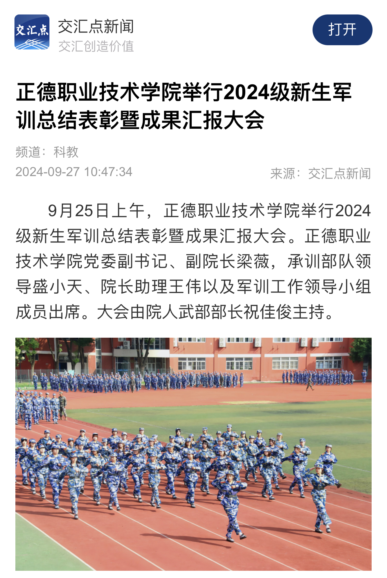 【交汇点新闻】正德职业技术学院举行2024级新生军训总结表彰暨成果汇报大会