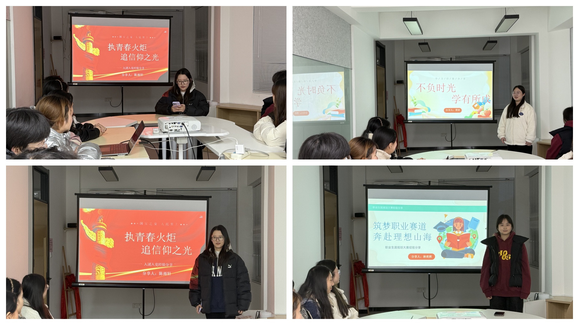 林奕然同学则分享了竞赛备赛与时间管理的独家心得。她以时间轴的形式,清晰地梳理了大学各阶段的学习重点与任务,强调了勤奋学习与积极参与评优评先对个人成长的关键作用。