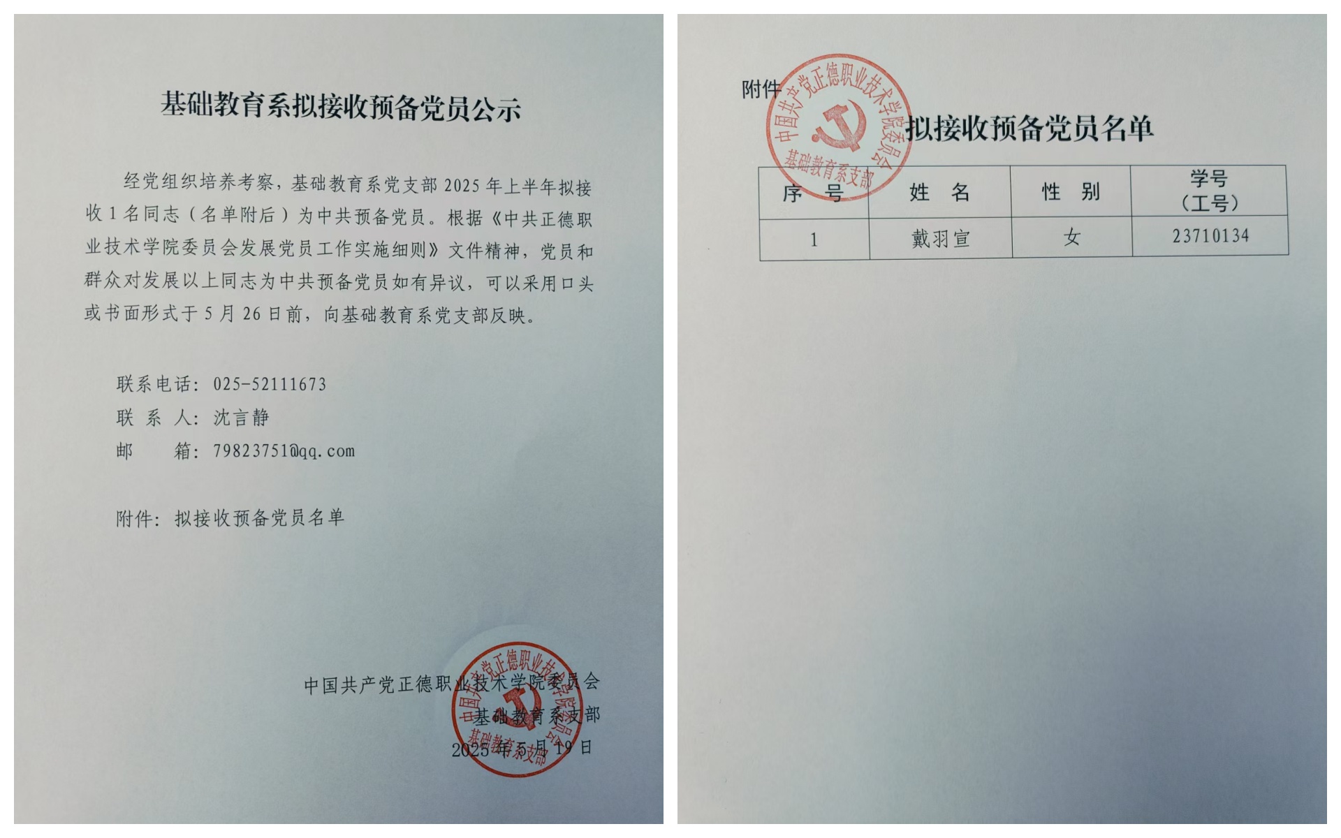 经党组织培养考察,基础教育系党支部2025年上半年拟接收1名同志(名单附后)为中共预备党员。根据《中共正德职业技术学院委员会发展党员工作实施细则》文件精神,党员和群众对发展以上同志为中共预备党员如有异议,可以采用口头或书面形式于5月26日前,向基础教育系党支部反映。