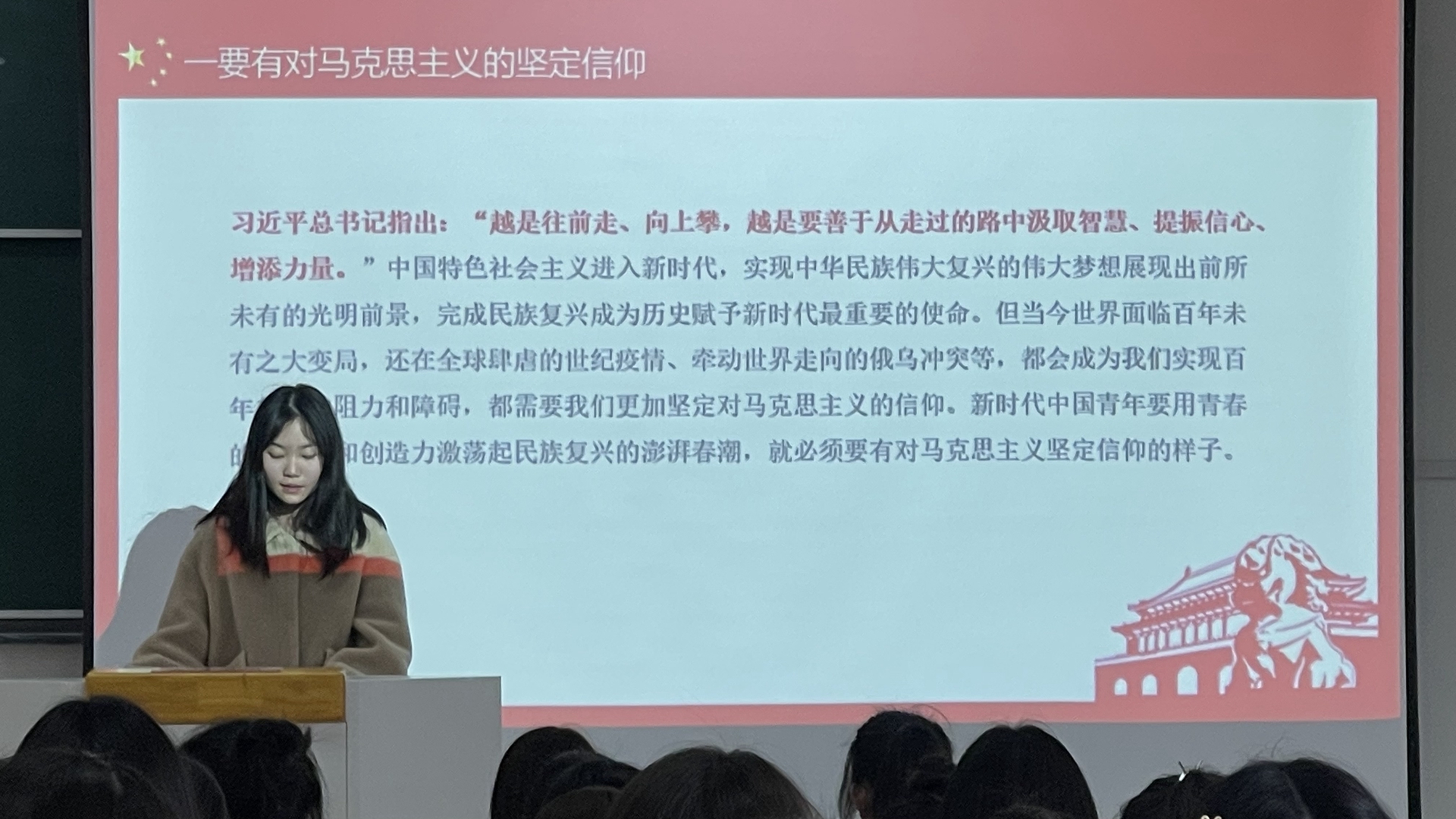 此次新思想公开课围绕“新时代青年要有的样子”展开,一共有五个部分:一要有对马克思主义的坚定信仰,二要对中国共产党的信赖忠诚,三要有对新时代责任的高度自觉,四要有对最高贵特征特质的充分坚持,五要有对守正创新力的深度砥砺。