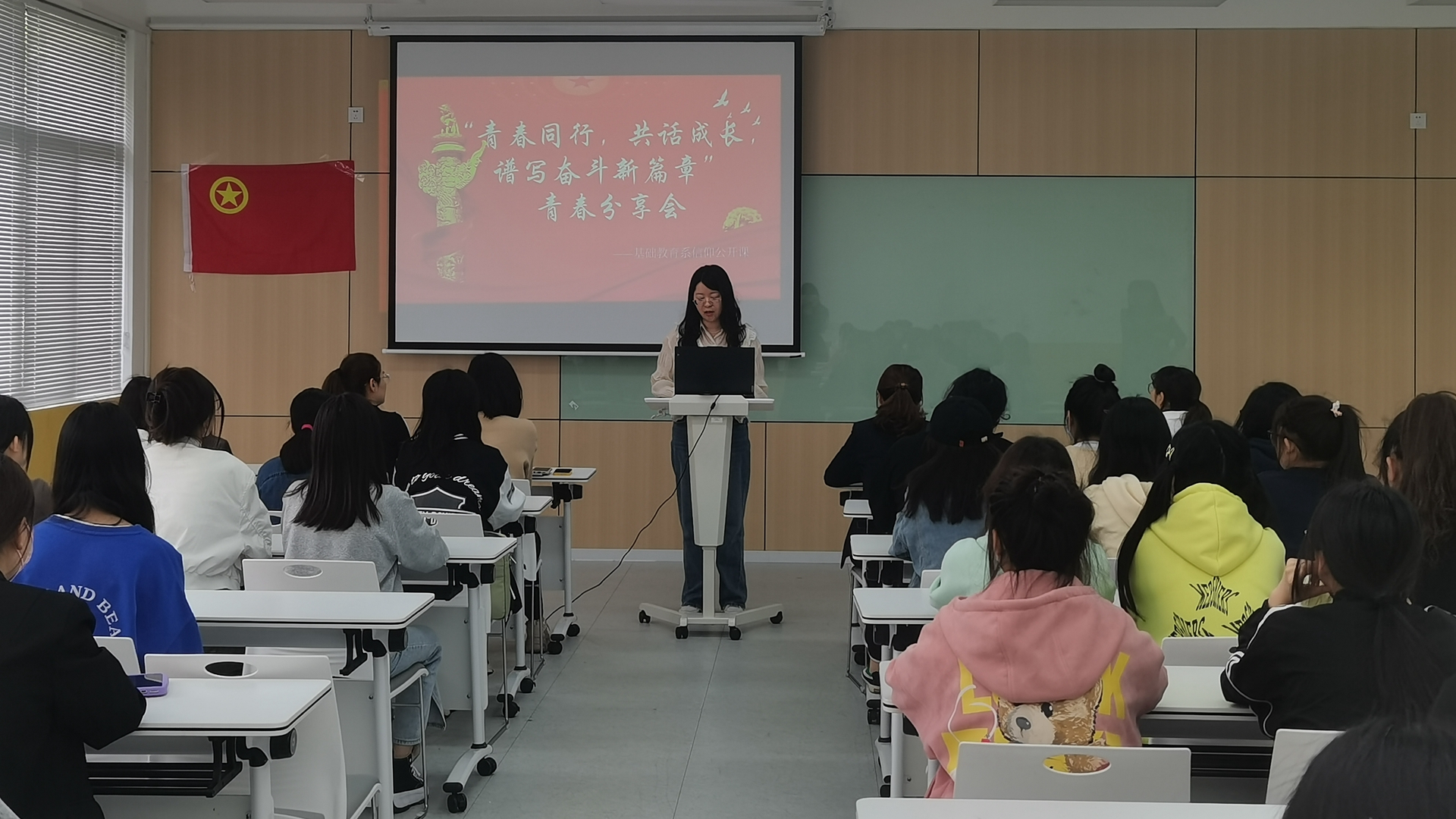 我系团总支创新信仰公课开展形式,特别邀请了秣陵街道翠屏社区的陈老师和何老师来校与我系学子共话青春,开展了一场青春分享交流会。首先,陈老师从自身工作讲起,作为一名基层社区工作者,在疫情期间,她主要负责社区人员排查、门岗管控、环境消杀、居家隔离户管控与服务等工作,讲述了青年一代的新生力量在社区抗疫前线的重要地位。除此之外,陈老师作为社区志愿者团队的负责人,2023年上半年就组织开展志愿服务活动50余次,内容涵盖社区宣传、文体活动、暑期课堂、心理辅导、环境治理、敬老爱老等方面。陈老师表示,要在平凡的岗位创造出不平凡的价值,勉励在座的同学要勤奋学习,不负青春时光。