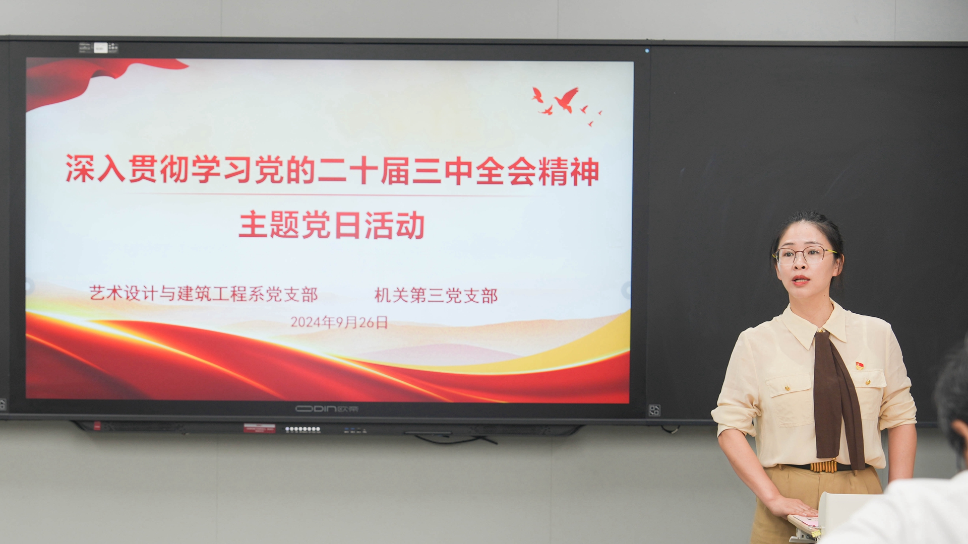 党的二十届三中全会是在以中国式现代化全面推进强国建设、民族复兴伟业的关键时期举行的一次十分重要的会议。全会审议通过了《中共中央关于进一步全面深化改革 推进中国式现代化的决定》,紧紧围绕推进中国式现代化这个主题擘画进一步全面深化改革战略举措,是指导新征程上进一步全面深化改革的纲领性文件。为深入学习领会全会精神,机关第三党支部与艺建系党支部于9月26日联合举办了“学习贯彻党的二十届三中全会精神”主题党日活动。此次活动由艺建系党支部书记杨春娟主持,两个部门的全体党员参加。