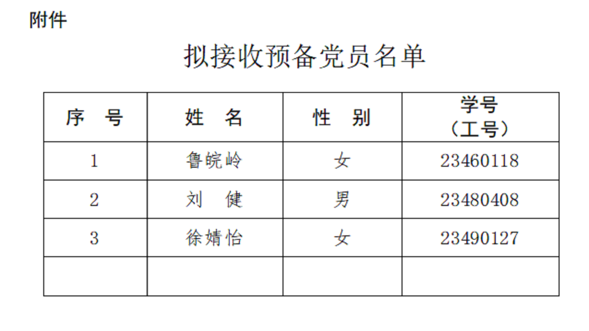 经党组织培养考察,艺术设计与建筑工程系党支部2025年下半年拟接收3名同志(名单附后)为中共预备党员。根据《中共正德职业技术学院委员会发展党员工作实施细则》文件精神,党员和群众对发展以上同志为中共预备党员如有异议,可以采用口头或书面形式于5月26日前,向艺术设计与建筑工程系党支部反映。