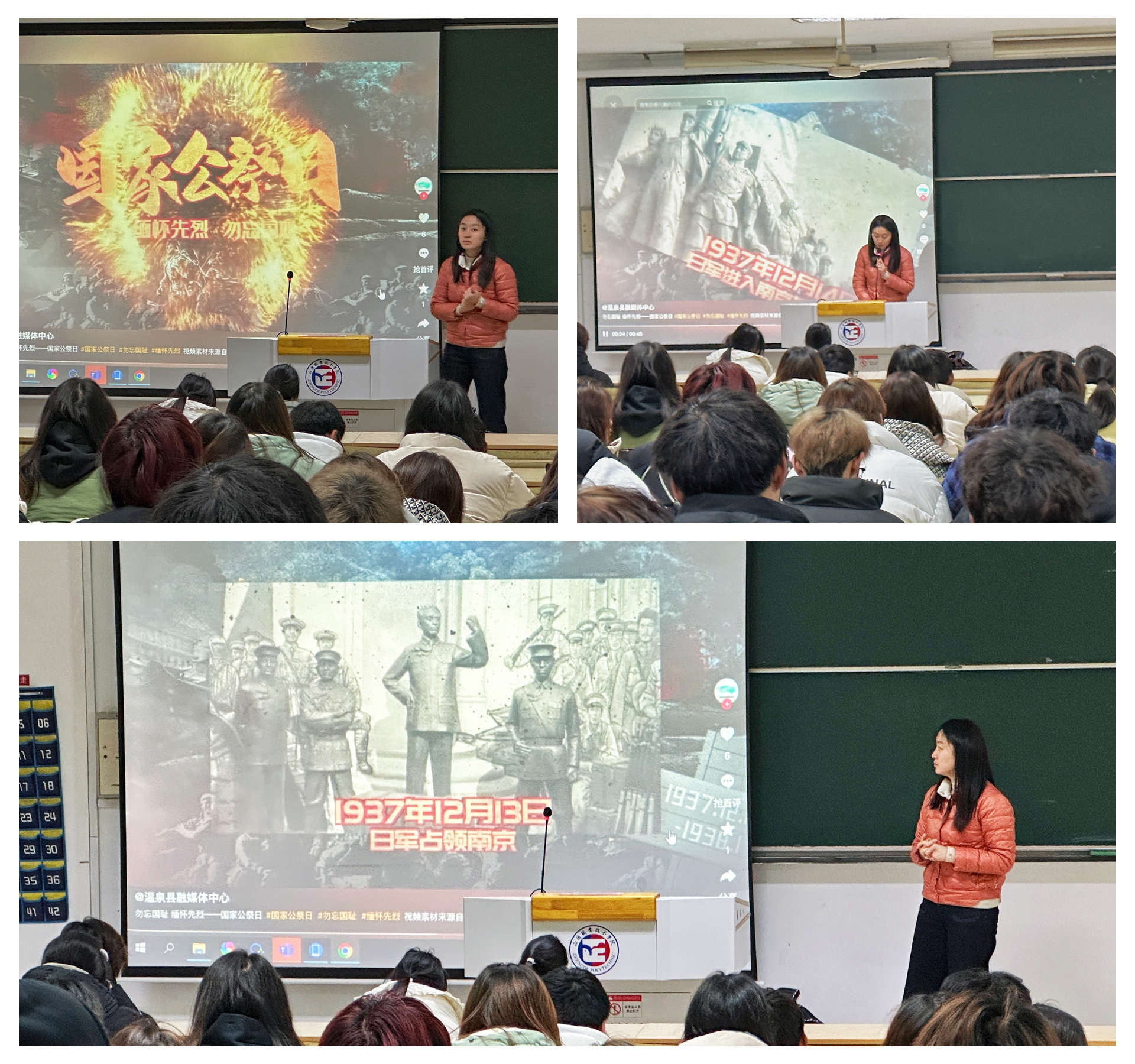 2023级建筑室内设计专业入党积极分子史金鹏同学精心组织了一场以“勿忘国耻,砥砺前行”为主题的国家公祭日主题团课。课堂上,史金鹏通过生动的讲解和丰富的多媒体资料,向同学们详细阐述了南京大屠杀的历史背景和深远影响。同学们听得全神贯注,时而眉头紧锁,时而义愤填膺,深深感受到了那段历史的沉重与悲壮。