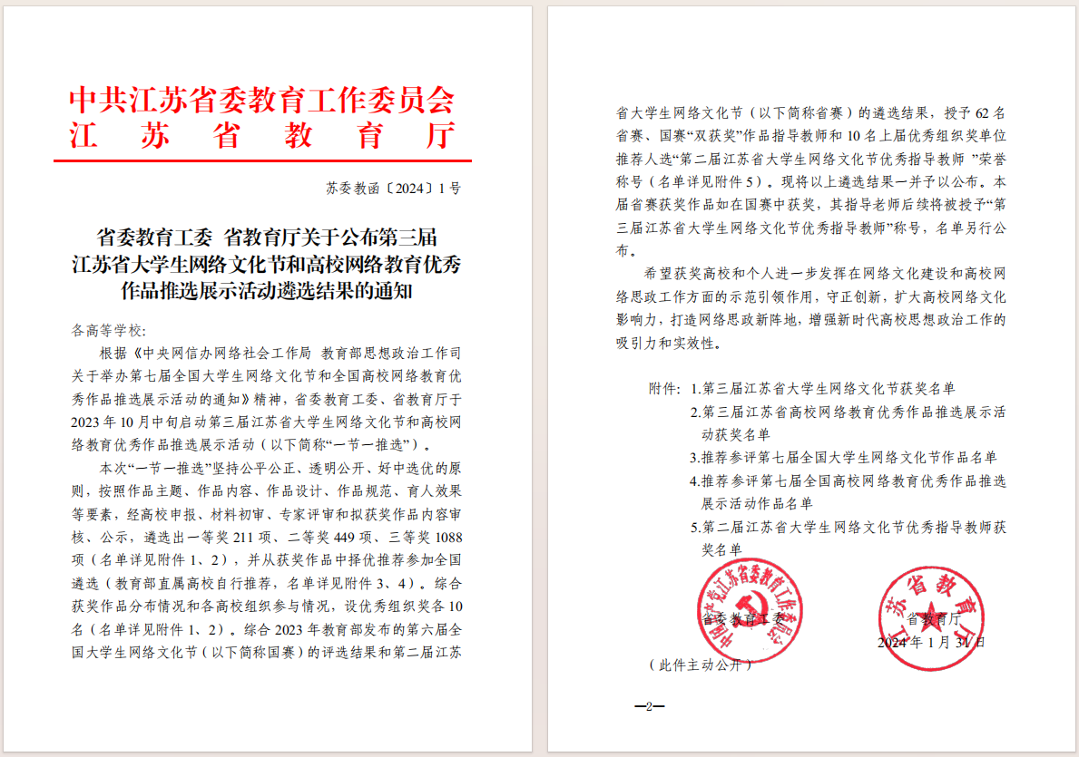 近日,由省委教育工委、省教育厅组织开展的第三届江苏省大学生网络文化节和高校网络教育优秀作品推选展示活动遴选结果发布。自2023年10月启动以来,学院高度重视、周密部署,相关部门加强沟通、广泛动员,征集到百余件优秀作品,经专业评委评审、择优推荐,blh漫画 共推选44件作品代表学院参与全省评比,共获得三等奖9个。其中3件作品被省教育厅推荐参加第七届全国大学生网络文化节评比。