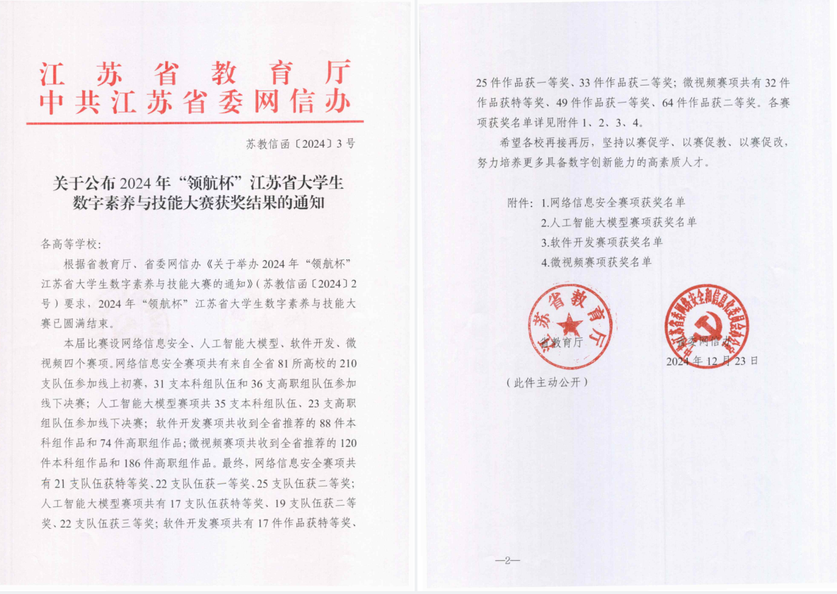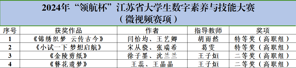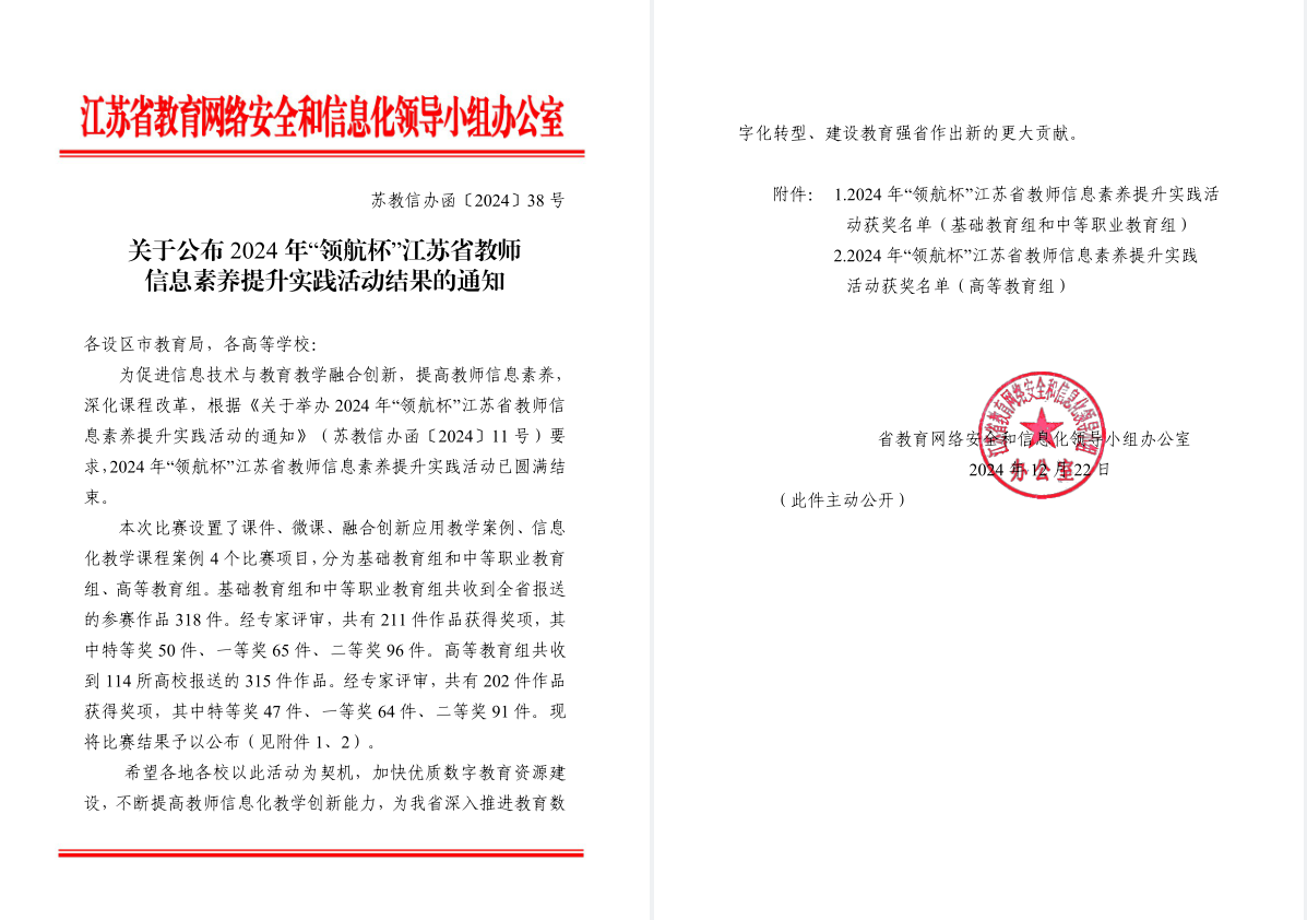近日,2024“领航杯”江苏省教育信息化应用能力大赛比赛结果公布,我院师生在比赛中取得新突破,荣获特等奖2项、二等奖3项,其中大学生数字素养与技能大赛中,闫怡均、王艺卿与宋从骁、张瑞希两个学生团队获特等奖,徐子墨、沈兰兰与王蕊、王晶晶两个学生团队获二等奖;在教师信息素养提升实践活动比赛中我院傅蕴男老师的微课作品荣获二等奖。
