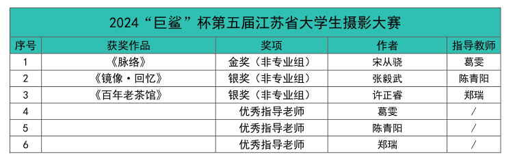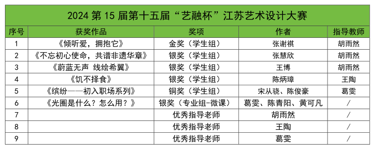 我院学子在赛事中共获得金奖2项、银奖5项、铜奖1项;教师获得专业组银奖1项、优秀指导教师6项。“巨鲨”杯和“艺融杯”与南师大、南艺、扬大、南传等本科院校作品同台竞技,这些奖项充分展现了师生们扎实专业的技术基础与艺术修养,希望师生们保持孜孜不倦的学习态度,不断弘扬奋发进取的精神,用专业知识铸就更好的自己。