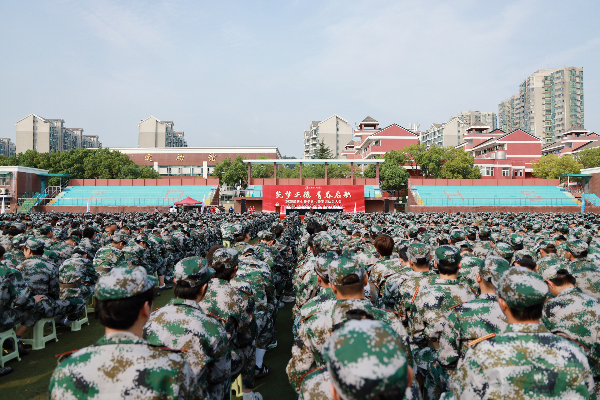 金风送爽启新程,青衿逐梦沐朝阳。9月17日上午,以“筑梦正德 青春启航”为主题的2025级新生开学典礼暨军训动员大会,在我院田径场隆重举行。全体院领导、院长助理,各系及相关单位主要负责人、全体新生辅导员,与3509名新生共同参会。中科院上海格思信息技术有限公司热控部主任陈谷雷、沭阳潼阳中学校长李健、承训部队代表刁嵘峥,以及我院2024届校友、南京国博电子股份有限公司戴立志应邀出席。大会由学院党委副书记、副院长梁薇主持。