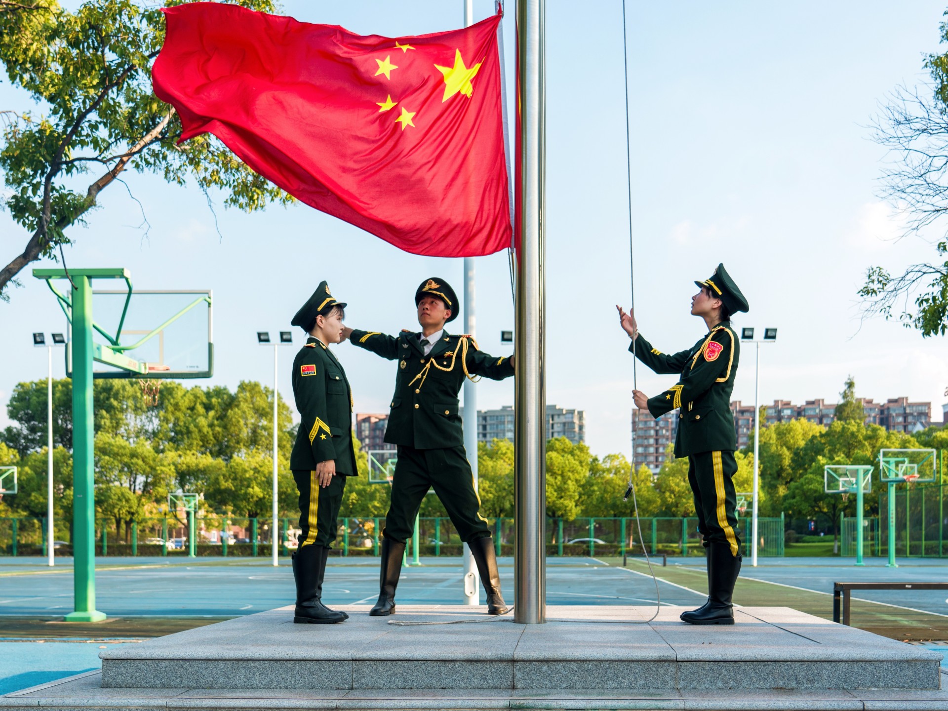 伴随着庄严的国歌声,国旗护卫队迈着整齐步伐升起五星红旗,大会正式拉开帷幕。