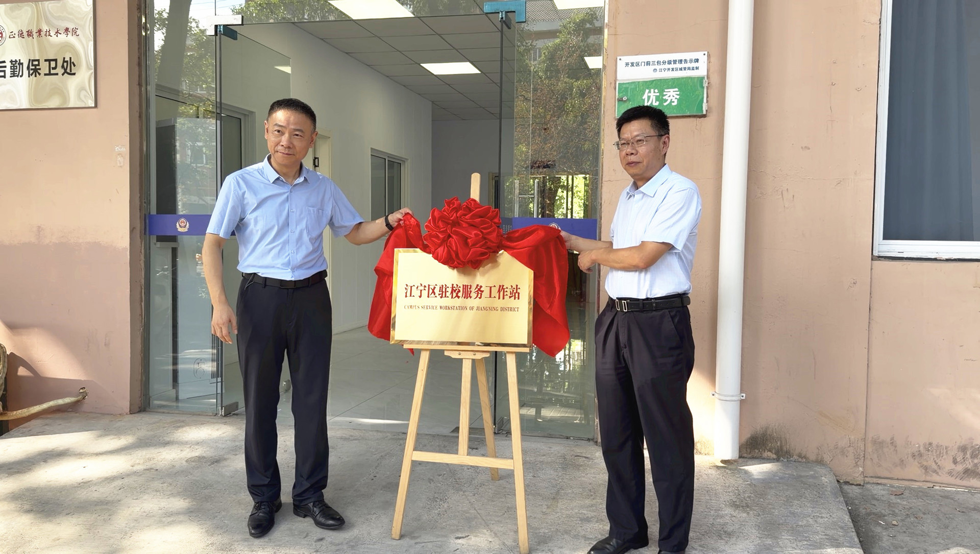 为进一步深化平安校园、法治校园建设,创新校园治理模式,切实保障师生合法权益,为师生营造更加安全、稳定、和谐的校园环境,9月23日下午,江宁区驻我院服务工作站揭牌仪式隆重举行。江宁区政法委副书记夏玉龙、治安科副科长郁卫国、刘海燕,我院副院长高斌、党群工作部、学生处、后勤保卫处负责人、各系党支部书记及学生代表共同出席了仪式。后勤保卫处处长陈宏波主持揭牌仪式。