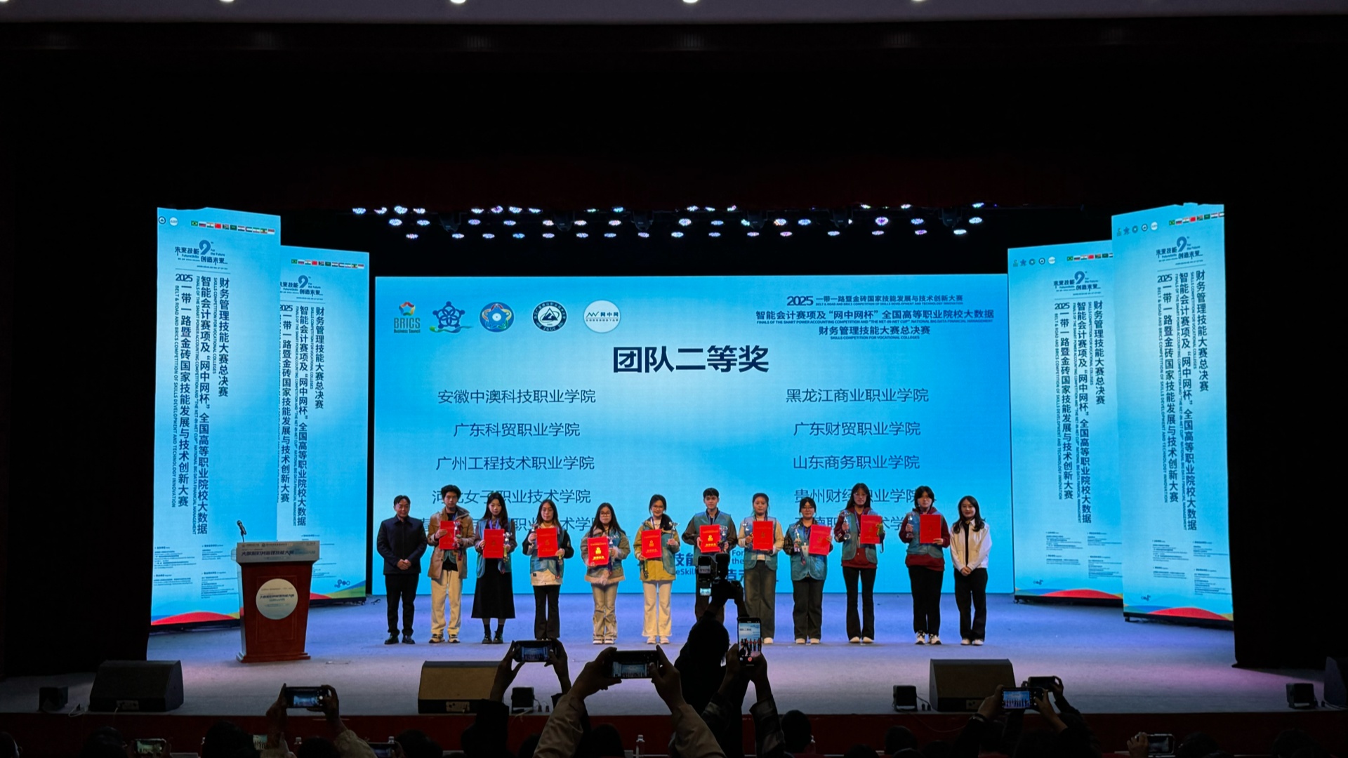 11月23日,我院经济与管理系在2025年一带一路暨金砖国家技能发展与技术创新大赛智能会计赛项全国总决赛中传来喜讯,由李家唸、王黎娜老师指导,吴雨轩、周言之、彭安琪、于童淼组成的代表队,凭借扎实的专业知识和默契的团队合作,荣获全国总决赛团队二等奖。同时,学院荣获“优秀组织奖”,这充分展示了学院在大数据财务管理、智能会计领域人才培养方面的实力。