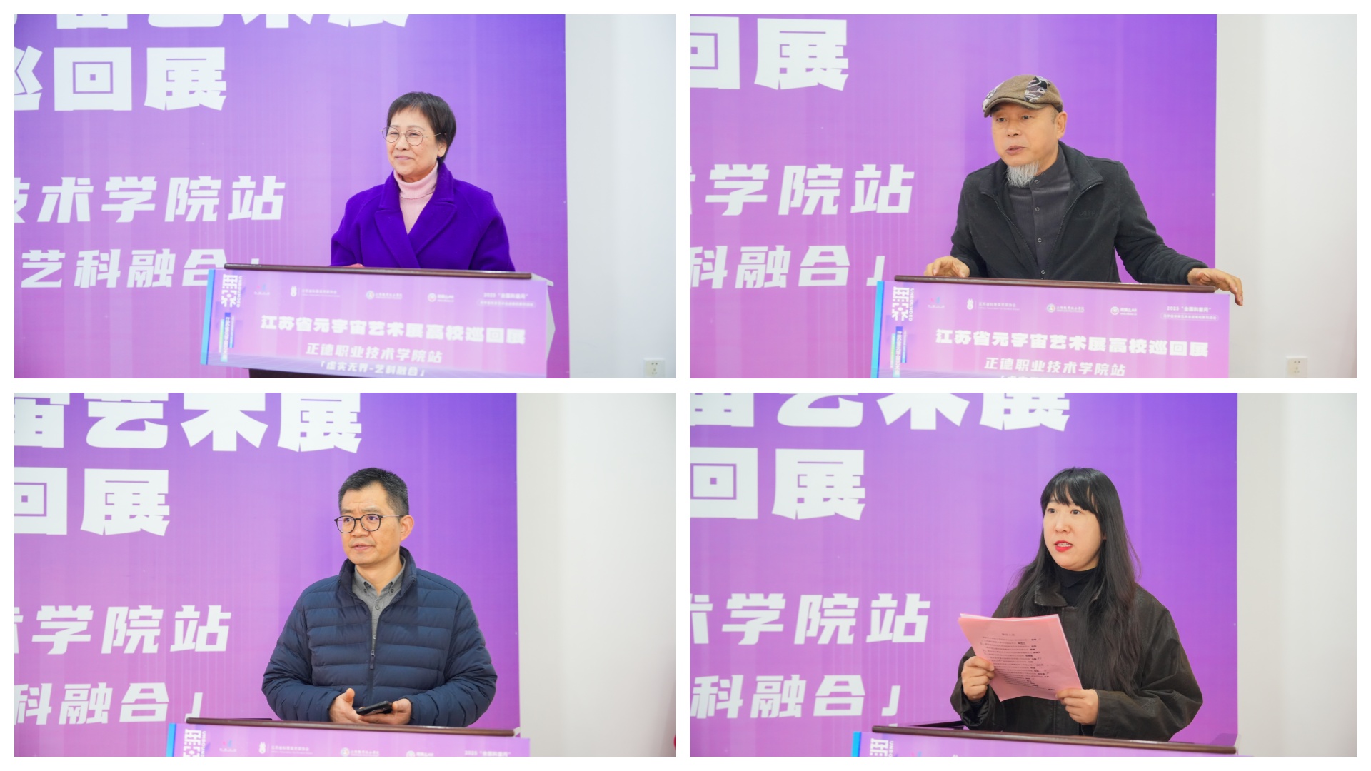 艺建系主任周卫首先致欢迎辞,对各位嘉宾的到来表示热烈欢迎。南京艺术学院元宇宙艺术与设计研究院负责人盛瑨教授致辞,他强调了元宇宙是科技与艺术融合的新领域,正逐步改变创作、教学与社会互动方式,为人才培养注入新动能。学院副院长赵宇发表讲话,她表示,正德学院始终秉持“科技赋能教育,创新引领未来”的办学理念。此次巡展落地我院,既是对我院在数字艺术教育领域探索的认可,也为师生们提供了零距离接触前沿科技的宝贵机会。她希望通过本次活动,激发同学们对元宇宙、人工智能等领域的兴趣,鼓励大家在创作中打破边界,在实践中探索真理,成为新时代“艺智共生”的复合型人才。并宣布巡展开幕。