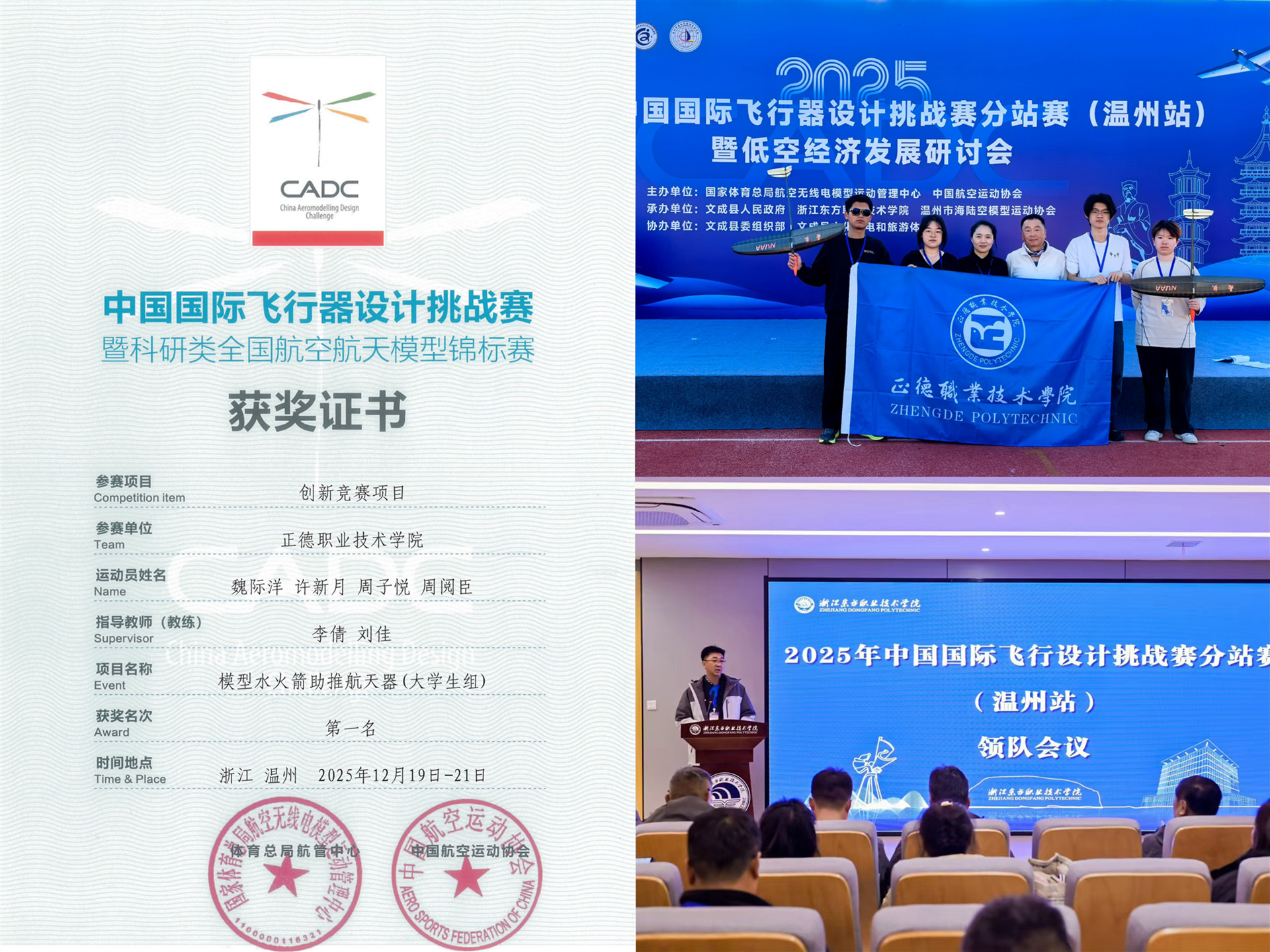 12月21日,2025年中国国际飞行器设计挑战赛(CADC)温州站在浙江文成圆满落幕。在“模型水火箭助推航天器(大学生组)”项目中,由我院航模队魏际洋、许新月、周子悦、周阅臣四名同学组成的代表队发挥出色,最终荣获该项目全国冠军,充分展现了正德学子精湛的专业技能与卓越的创新实践能力。