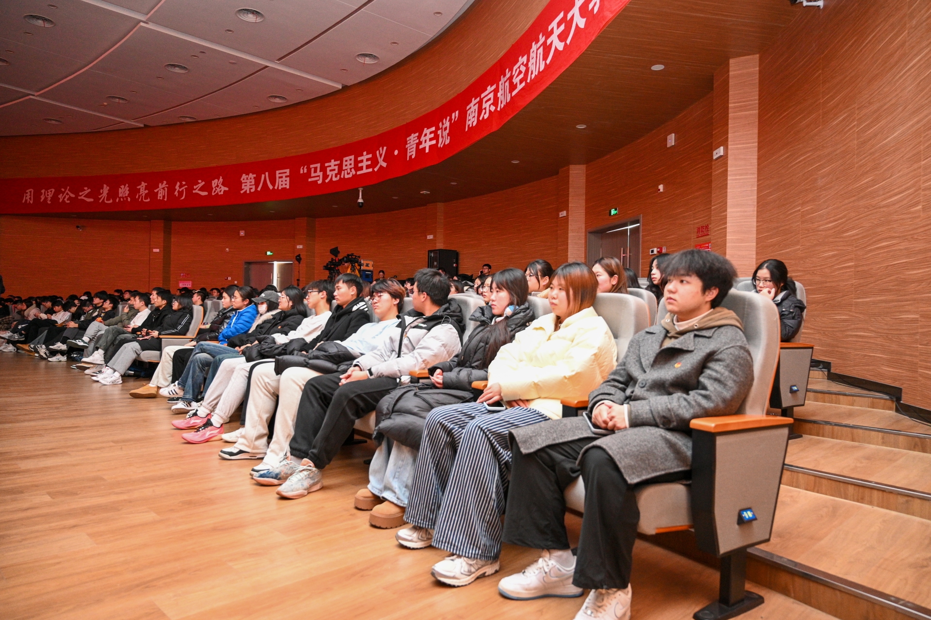 “科技强国,有我!民族复兴,有我!”12月20日,由省委宣传部、省委省级机关工委、省委教育工委、共青团江苏省委、新华报业传媒集团共同主办,新江苏传媒(中国江苏网)承办的第八届“马克思主义·青年说”活动走进南京航空航天大学。为团员青年们带去一场理论盛宴,引导他们在新时代的浪潮中,深刻领悟科学家精神,肩负起推动科技创新、实现科技强国的责任使命。我院团委副书记魏兴彪带领学院第十四期“青马工程”学员和系班团学骨干共150余人参加此次活动。