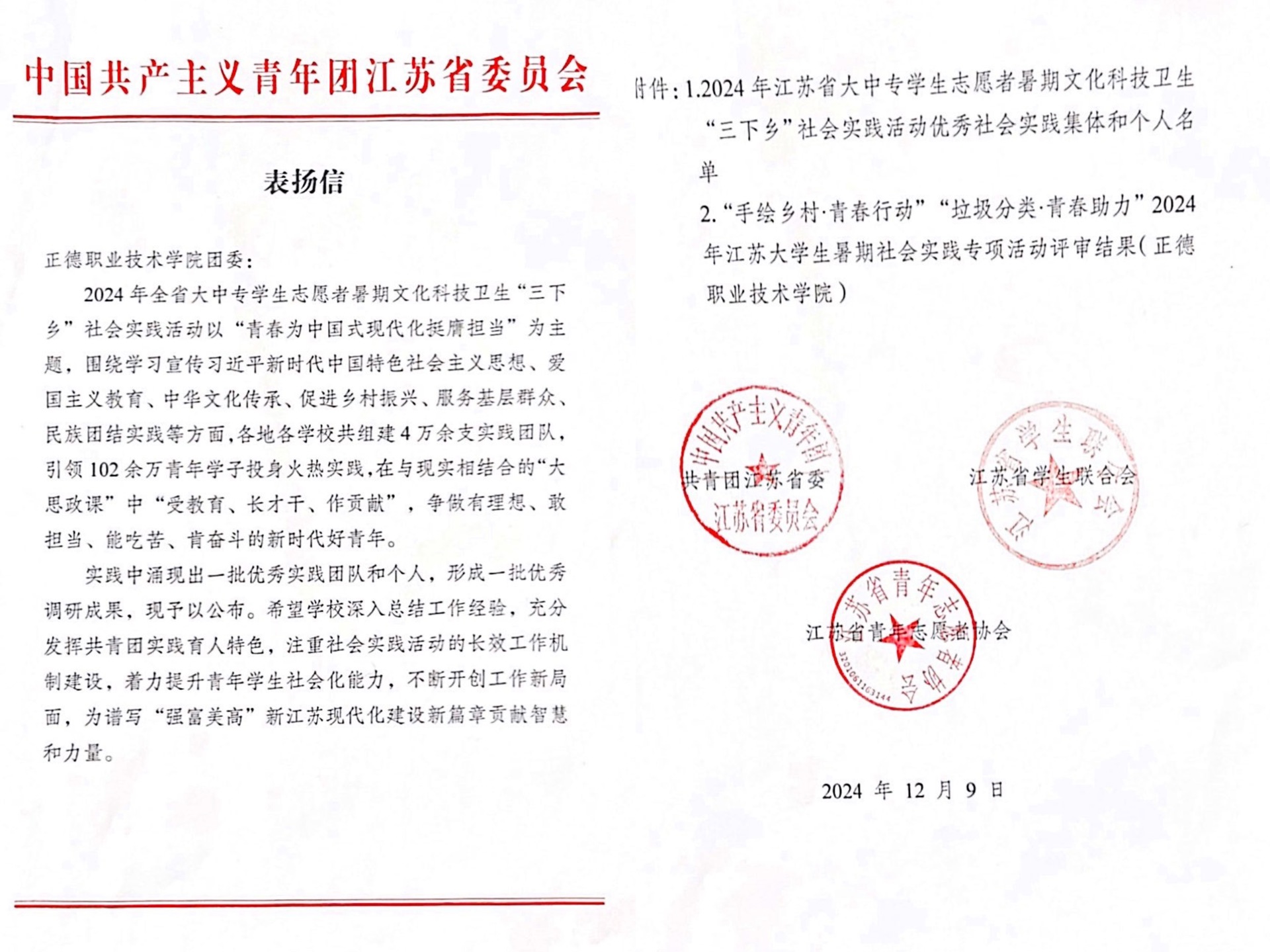 近日,共青团江苏省委、江苏省学生联合会、江苏省青年志愿者协会三部门联合对2024年江苏省大中专学生志愿者暑期文化科技卫生“三下乡”社会实践活动表现优秀的集体及个人进行了表扬,此次我院暑期社会实践活动荣获省级荣誉9项,并首次获评全国重点立项团队1个。