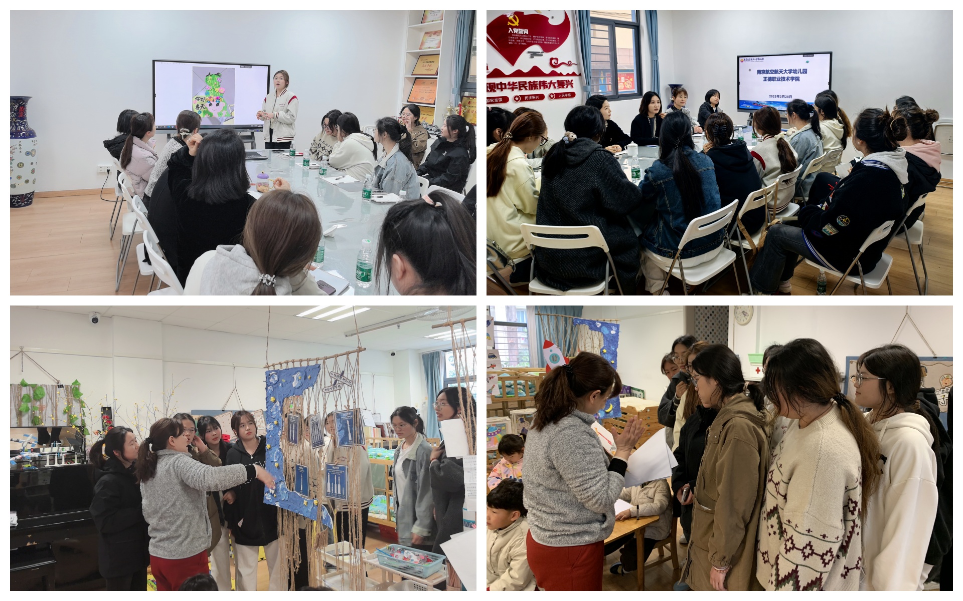 3月28日,基础教育系专业教师孟馨应邀带领部分大二学生,将本学期幼儿园教育环境创设课程部分作品于南京航空航天大学幼儿园展出,受到了南航幼儿园及幼儿美术教研组教师的一致好评。