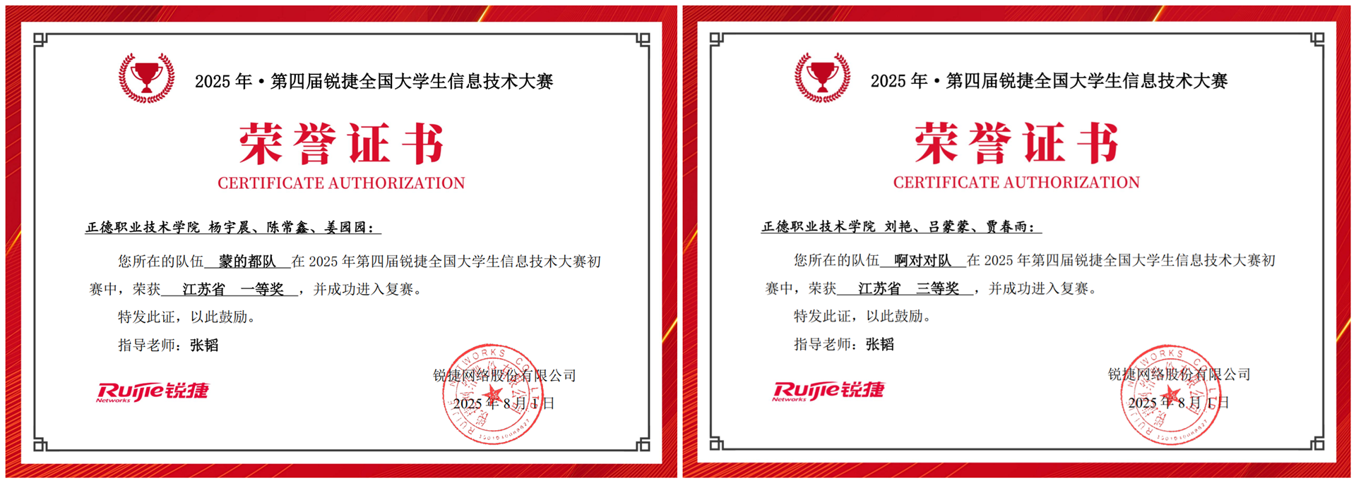 近日,第四届锐捷全国大学生信息技术大赛初赛圆满落幕,我院电子信息与技术系学生今年在本次赛项中获得突破,分别取得一等奖和三等奖各一项。